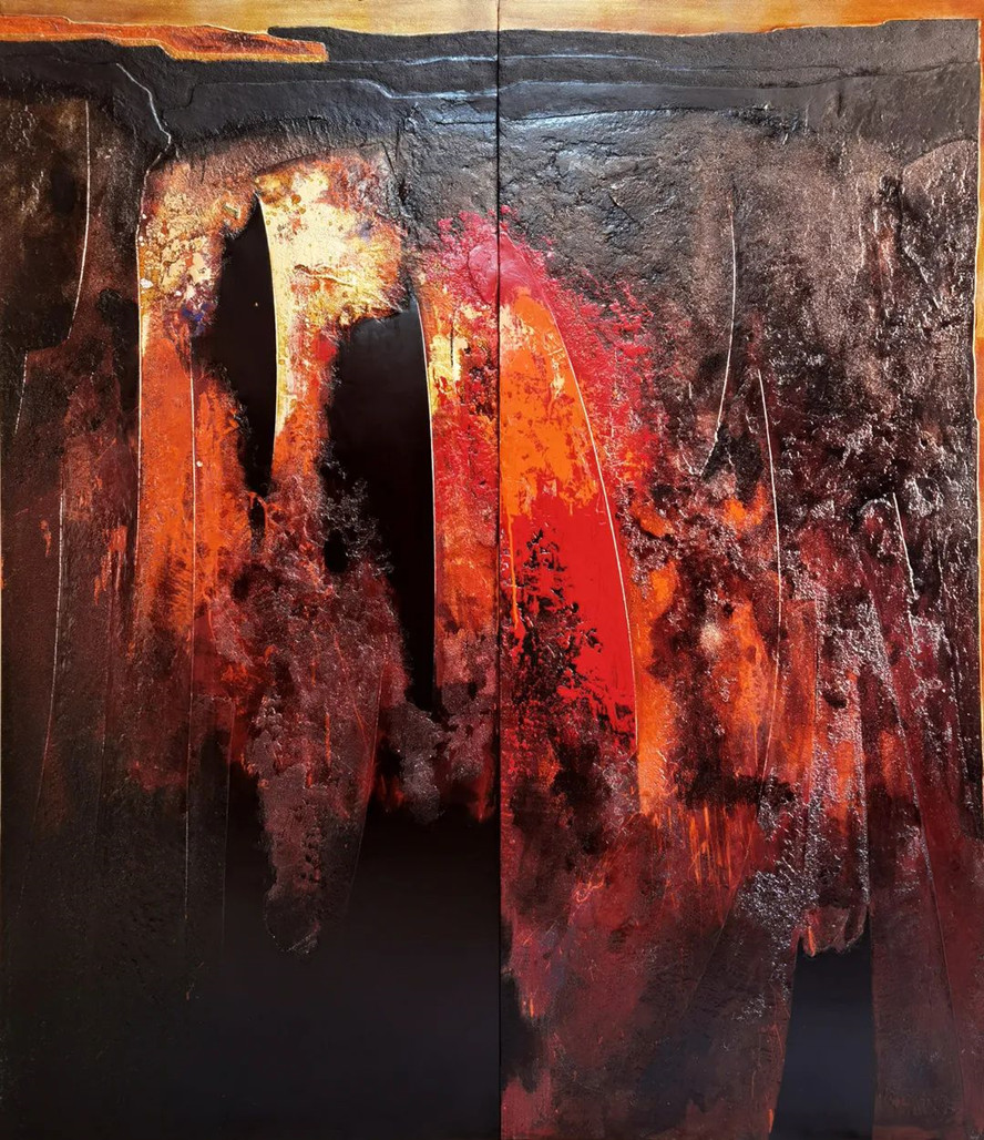 李小军教授的作品《山衣》尝试在当下追寻人与自然的永恒命题,追求雄浑质朴、充盈饱满的艺术气息,是他多年来探索绘画民族性、时代性、意象性的又一成果。许荣聪老师近年来在漆画语言、传统的转化和创新方面进行不懈的努力,该作品是以当代的视角对传统题材进行艺术性的演绎和再创作的成果。