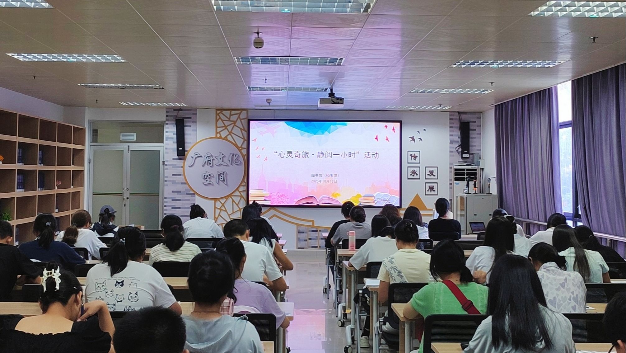 本网讯 10月18日下午,图书馆(档案馆)在广府文化空间开展了“心灵奇旅·静阅一小时”活动,此次活动吸引了来自全校各二级学院50余名同学踊跃参与,大家暂时放下电子设备,共赴一场书香之约。