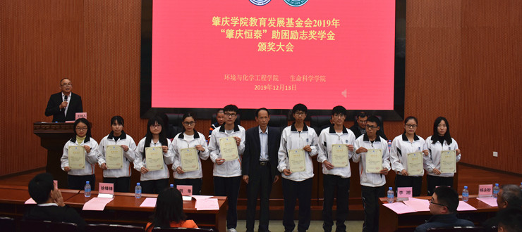 本网讯 近日,环境与化学工程学院、生命科学学院在学术报告厅举行肇庆学院教育发展基金会“肇庆恒泰”2019年度助困励志奖学金颁奖典礼。肇庆恒泰经济发展有限公司行政经理董世德、肇庆学院教育发展基金会秘书长白志明、环境与化学工程学院、生命科学学院相关负责人出席,企业代表、教师代表、受表彰的学生及各班级学生代表近400人参加。