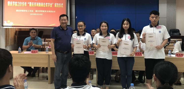 本网讯 5月28日,肇庆市河南商会奖学金颁发仪式在我校举行。肇庆市河南商会会长罗豫鄂,校党委委员、教育发展基金会理事长沈钦萍,学生工作处处长陈向荣出席仪式。