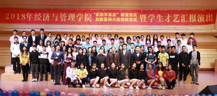 本网讯 12月7日晚,经济与管理学院举行2018-2019学年度奖助学金颁奖、技能大赛颁奖仪式暨学生才艺汇演。广东天龙油墨集团公司代表王中生先生,肇庆市金鹏电子科技集团公司总经理张家生先生,肇庆学院教育发展基金会秘书长钟伙彬出席,经管学院师生代表参加。
