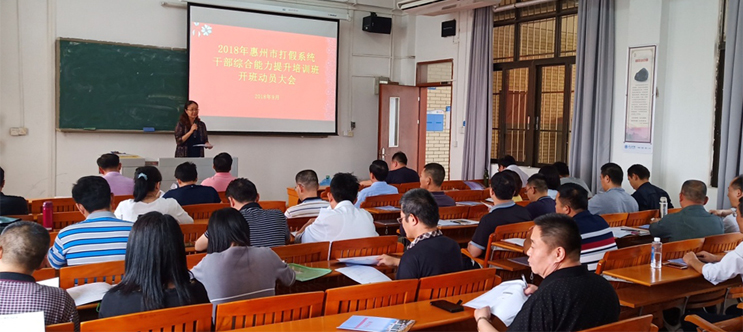 图片说明:10月22日—24日,由惠州市打假办组织、继续教育学院承办的2018年惠州市打假系统干部综合能力提升培训班在我校举行,共有来自惠州市打假系统的近40位干部同志参加了培训。本次培训旨在提升惠州市打假系统干部的政治素质和业务能力。