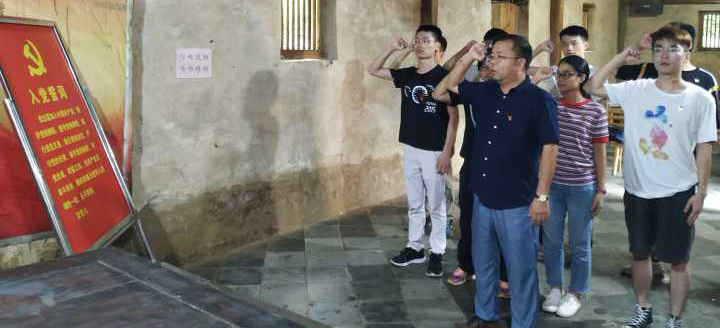 在东沟红色爱国主义教育基地,生产实习临时党支部书记蔡超明老师、生产实习带队李剑英老师和11名学生党员参观东沟中原突围鄂西北历史纪念馆,学习中原突围南路部队在东沟建立革命根据地的历史,观看中原突围战役留下的革命文物和历史资料,聆听解说员为我们讲解革命烈士的英勇事迹。最后,全体党员面向党旗重温入党誓词。