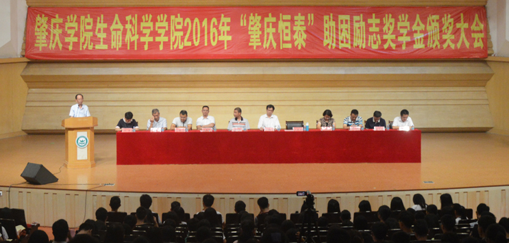 本网讯 10月26日,生命科学学院举行2016年“肇庆恒泰”助困励志奖学金颁奖大会。副校长林俊睦,校党委委员、教育发育基金会理事长沈钦萍,肇庆市恒泰经济发展有限公司经理董世德等领导嘉宾,以及生科院负责人出席。