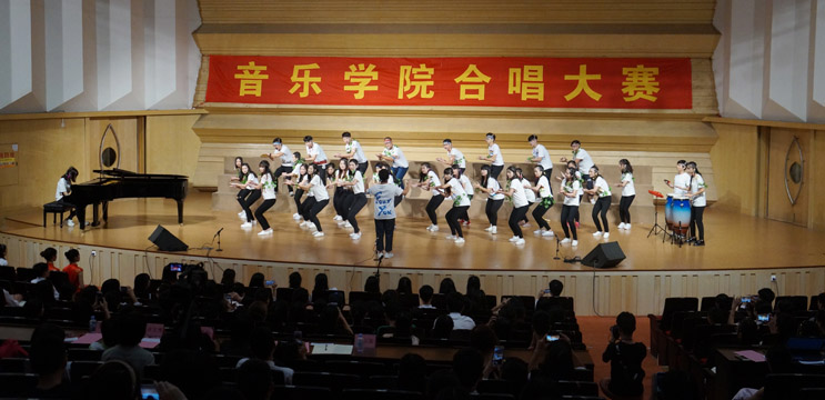 2013级音乐学4班的合唱《克劳族印第安民谣》、2014级音乐表演1班的《贝加尔湖畔》以惟妙惟肖的声音、精心设计的动作以及意境之悠美,共同夺得比赛夺冠。