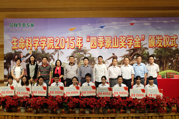 本网讯(记者 何嘉辉 李玉婷)11月23日,生命科学学院“四季景山”奖学金颁奖大会在音乐厅举行。校党委书记曾桓松、广东四季景山园林建设有限公司副总经理袁和和、生科院党政负责人出席活动。