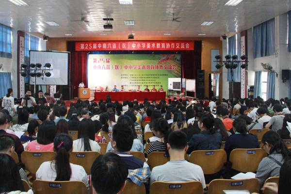 本网讯(记者 洪嘉敏 陈利红)11月18日—21日,第二十五届中南六省(区)中小学美术教育协作交流会在我校举行。与会代表通过美术现场课教学观摩、教学论文评比交流、学生美术作品展以及专家评课和专题讲座等一系列活动,深入探讨中小学美术教育改革的方向和路径。来自广东、广西、湖南、湖北、海南、河南六省(区)的美术教研员及美术教师近900人参加本次交流。