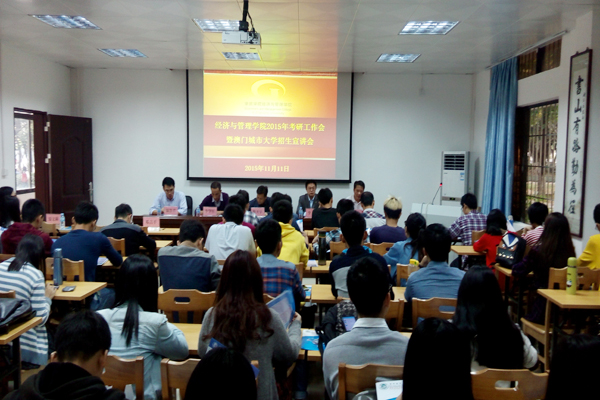 调研座谈会后,经管学院举行了考研工作会议暨澳门城市大学宣讲会。澳门城市大学国际旅游与管理学院副院长李玺和温慧君博士、经管学院有关负责人参加,90多名有考研意向的学生听取宣讲会。