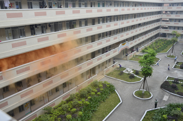 据悉,参与此次演练的学生人数多达20000,共释放烟雾弹19个,启动报警器15个以及使用4kg干粉灭火器60个。