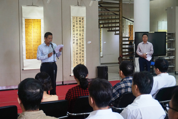 周苏平致开幕辞,代表学校向莅临指导的领导、专家及各界朋友表示热烈欢迎和诚挚问候。他强调,此次展览,既是我校书法教育历史上的一件大事,也是我校砚园文化建设的重要活动之一。书法是中华民族传统文化的瑰宝,让传统文化世代延续、永葆活力,是高等教育义不容辞的责任。他表示,近年来我校不断加强校园文化建设,未来我校将紧跟时代潮流,抓住契机,以文化软实力促进地方经济硬实力的提高,努力打造蕴育深厚传统文化的砚园文化,并为把肇庆学院建成全省乃至全国的文化强校做出更大的贡献。