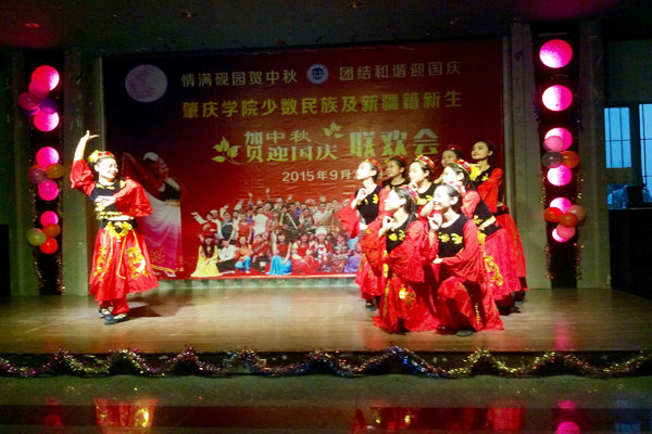 联欢会以“情满砚园贺中秋,团结和谐庆国庆”为主题。教育学院新疆籍学子表演维吾尔族舞蹈《花园》,热情奔放的舞姿充分地展现了新疆学子能歌善舞的文艺特长;白族和苗族的学子献唱民歌《白族民歌》、《苗岭谣》,博得了观众的阵阵喝彩;音乐学院少数民族新生带来的《民族舞串烧》展示出民族大团结的和谐与安康;2015届新疆籍毕业生欧阳春子献上涵盖四种民族风格的舞蹈,把现场气氛推向了高潮。最后联欢会在演员们的歌曲大联唱中落下了帷幕。