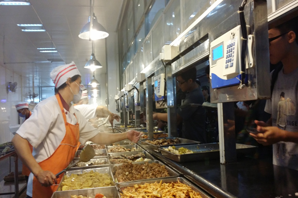 来到肇庆学院第四食堂时正值中午时分,记者见到,打饭窗口前排起了长长的队伍,食堂员工正忙碌着为师生打饭。仔细观察食堂环境,只见地面干净,餐桌整洁,正对食堂门口的墙壁上,一块LED屏显示着食堂各个工作区间的实时情景,让师生一目了然。