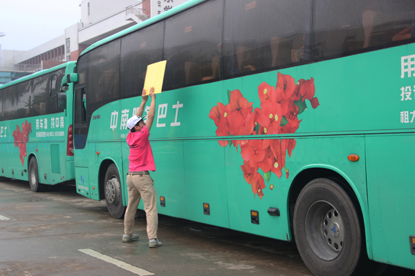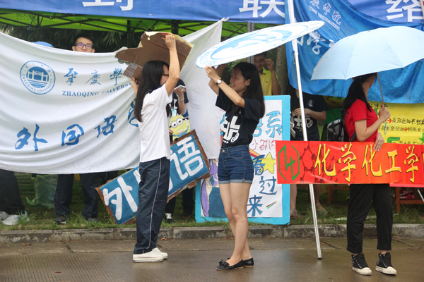 为了迎接刚到的新生 工作人员吃力地高举牌子
