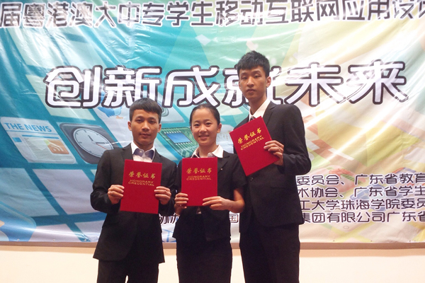 本网讯(计算机学院 软件学院 通讯)6月28日,第五届粤港澳大中专学生移动互联网应用设计大赛终审答辩在北京理工大学珠海学院举行。我校软件学院12级学生肖敬辉、张增荣、陈茜茜参赛作品《移动无水洗车》荣获概念组三等奖。