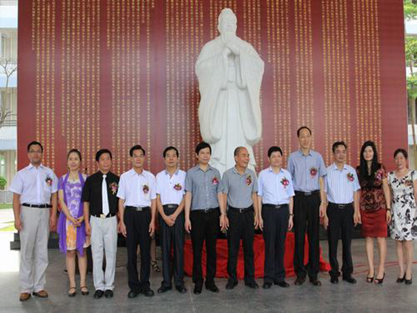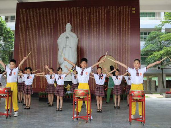 在仪式上,陈定坤、谭锦添、曾桓松、和飞等领导和嘉宾共同为孔子圣像揭幕。红色幕布徐徐拉下,庄严的孔子圣像卓然而立,现场响起了热烈的掌声,全体与会人员一起向孔子塑像行“拜师礼”。附中校长吴穗章宣读《孔子礼赞》,全校师生两千人集体诵读《论语》,20多位小学部学生家长上台吟诵《诗经.蒹葭》。小学部学生还表演了集国学经典、太极拳与舞蹈以一身的节目《经典美》。