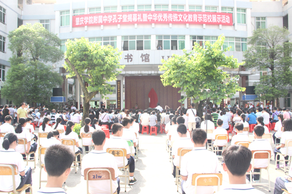 本网讯(记者 黎鉴远 徐子敏)6月9日上午,肇庆学院附属中学孔子堂揭幕礼暨中华优秀传统文化示范校展示活动在附属中学隆重举行。市委常委陈定坤、市教育局局长谭锦添,校党委书记曾桓松、校长和飞、副校级干部胡宝坚等领导,端州区中小学校长、附中全体师生、学生家长代表共2000多人参加。