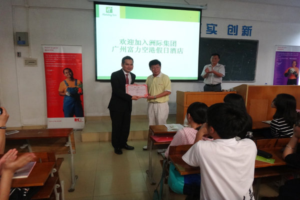 本网讯(旅游学院 通讯)4月24日,旅游学院聘请广州富力空港假日酒店(洲际集团)邓培志总经理为毕业生做了“酒店行业发展前景和毕业生期望”为题的报告,并现场招聘毕业生。同时,学校党委副书记叶峥嵘出席,为邓培志总经理颁发兼职教师聘书,旅游学院相关负责人及全体毕业生参加。