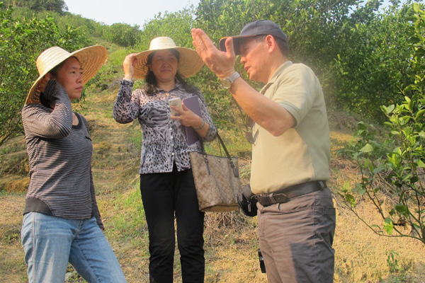 本网讯(果树所 通讯)果树所所长吉前华近日陪同来肇考察的国家现代农业(柑橘)产业技术体系岗位科学家邓晓玲、美国科学家植保专家孙小桉一行,一起到本地果园考察柑橘病虫害情况,并探讨对策。