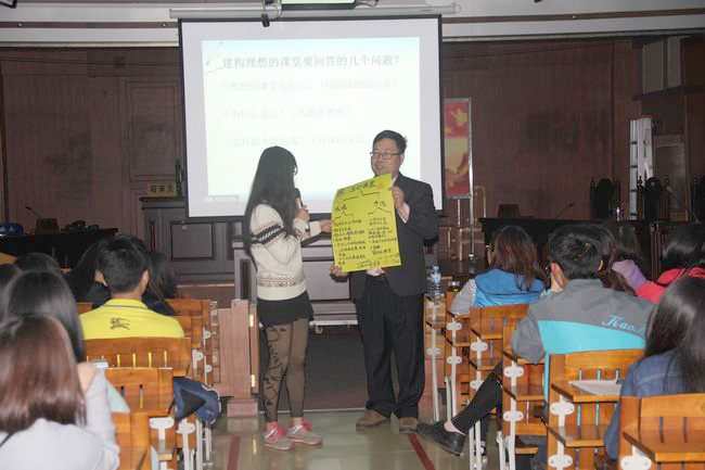 龙校长结合其留学经历介绍了中外课堂教学的不同之处,并由此向同学们提出“什么是理想课堂”的问题。同学们分组讨论,积极回应,课堂氛围一下子活跃起来。接着,龙校长让同学之间互相点评各自关于理想课堂的观点,更是引发了大家积极讨论的兴趣。随后,龙校长进行了深入浅出的归纳总结,阐述了自己心目中的理想课堂,就是要加强师生互动,积极开展课堂讨论,营造教学相长的良好氛围。一次关于如何建构理想课堂的活动在同学们的充分肯定中圆满完成。