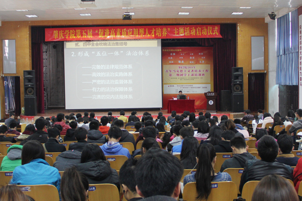 本网讯(记者 曾书洁 王国行 郑夏蓉)青年马克思主义者培养工程第二期团学干部培训班第四讲近日在学生活动中心大礼堂举行。本次讲座围绕“依法治国与大学生的责任——学习贯彻党的十八届四中全会精神”的主题展开,校党委副书记叶峥嵘担任主讲人。