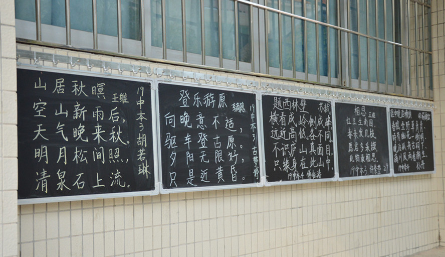 师范生练习黑板字的活动在我校由来已久,从过去学生在教室内自行练习,到如今由学校发放用具并派人定时检查,各个专业的师范生每日奔赴教学楼执行写小黑板任务。黑板字的内容也做出了一定调整,例如英语专业的学生誊写英文美句,文科专业的学生练写唐诗宋词,理工类的学生甚至还手绘图画……校园从此多了一道道亮丽的风景线——随处可见的携带小黑板的学生,走廊上排列整齐的小黑板,课间拿着笔记本登记板报情况的老师。