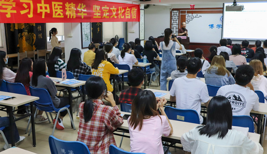 蓝韶清以“学习中医精华,坚定文化自信”为题,回顾了从古至今中医药的发展史,展现了各个时期中医的杰出成就。他以葛洪《肘后备集方》中“青蒿一握,以水二升渍,绞取汁,尽服之”为例为屠呦呦提取青蒿素,消灭疟疾起到关键作用,说明了中医药在人类对抗瘟疫发挥的重大价值。同时,他还围绕中医学的发展简史、中医的人文情怀、中医的智慧结晶、中医的基本理论等多方面进行了深度讲解,向师生展示了中医医者的精湛医术,高尚无私的人文情怀。