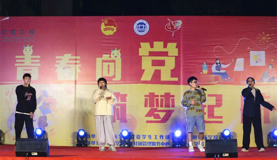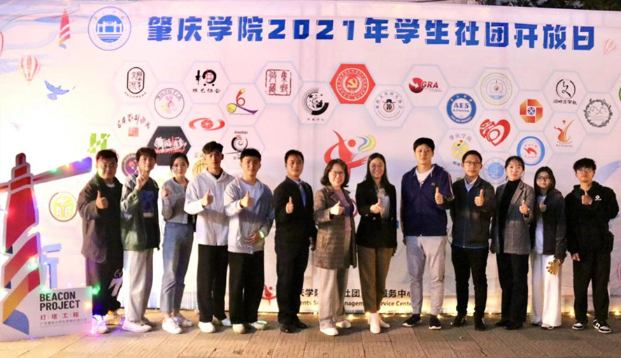 23日晚,“青春向党·筑梦起航”肇庆学院2021年学生社团开放日暨学生社团招新晚会在现场架设的主舞台上演。结对共建单位、广东信息工程职业学院团委的师生们参观社团招新现场并观看社团开放日晚会。