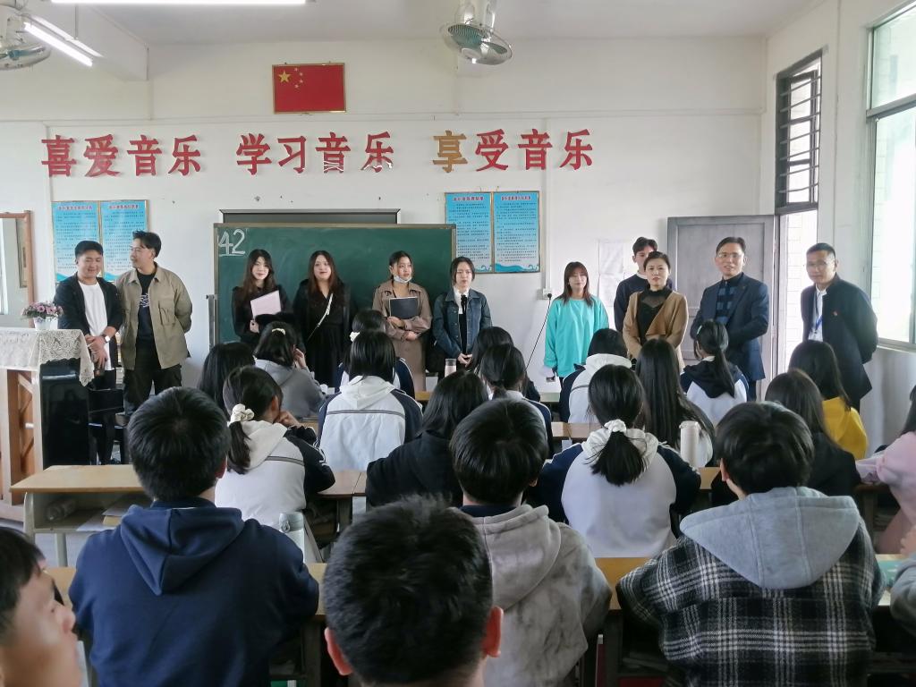 音乐学院一行来到艺术特色学校怀集县第二中学,参观校园,了解学校基本情况,并向学校捐赠了一批音乐教学器材。期间,参与本次活动的声乐教师郑以漩副教授以讲座的方式,与怀集二中的同学们进行了分享交流,鼓励大家面向未来,规划学业,打好成长成才的基础。随后,学院一行又来到肇庆市唯一一个壮瑶民族乡下帅,走访和看望在下帅民族学校实习的实习生。当了解到该校今年中考升学率在全县名列前茅时,学院师生感到欣慰和鼓舞。