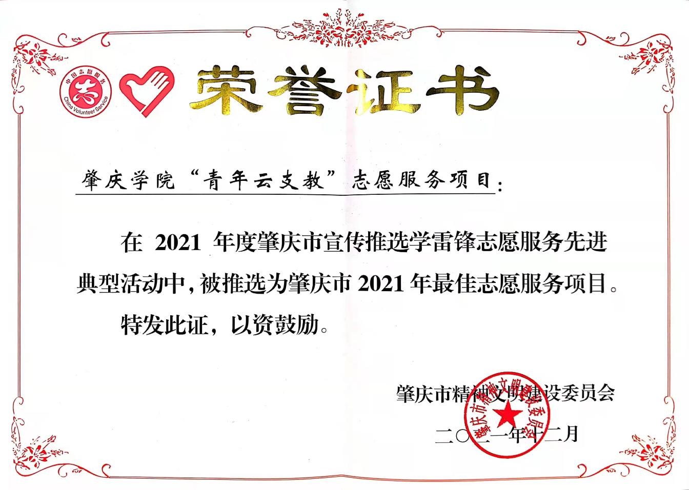 本网讯 为大力弘扬志愿精神,进一步健全志愿服务体系,推进志愿服务制度化常态化,肇庆市近日组织开展2021年度肇庆市学雷锋志愿服务先进典型评选活动。经评选,我校“青年云支教”志愿服务项目成功被推选为2021年肇庆市最佳志愿服务项目。