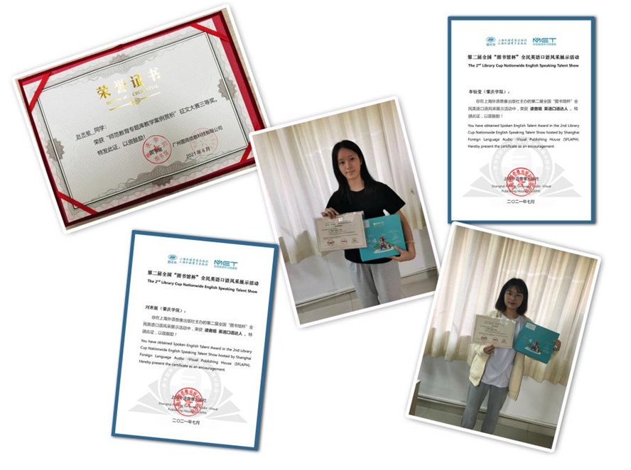 在以“百年辉煌,世界听我说”为主题的第二届全国“图书馆杯”全民英语口语风采展示活动中,经济与管理学院刘寒妮和生命科学学院李钰莹两位同学荣获“英语口语达人”称号。该次活动由上海外语音像出版社主办,全国1019所图书馆参与,共计59925人报名参赛。在以“奋斗百年路 启航新征程”为主题的第十届“图书馆杯”广东全民英语口语大赛中,数学与统计学院陈欣琳和外国语学院卓凯欣两位同学喜获优秀奖。本次活动由广东省立中山图书馆联合广东图书馆学会、广东省高校图工委共同主办,全省171所图书馆参与组织,21659人报名参赛。在2021年广东大学生“师范教育专题库教学课例赏析征文”大赛中,文学院赵思敏同学喜获三等奖。本次活动由图书馆协同广州图苑信息科技有限公司联合举办,意在鼓励师范生提高自身专业实践技能水平和教书育人的能力。