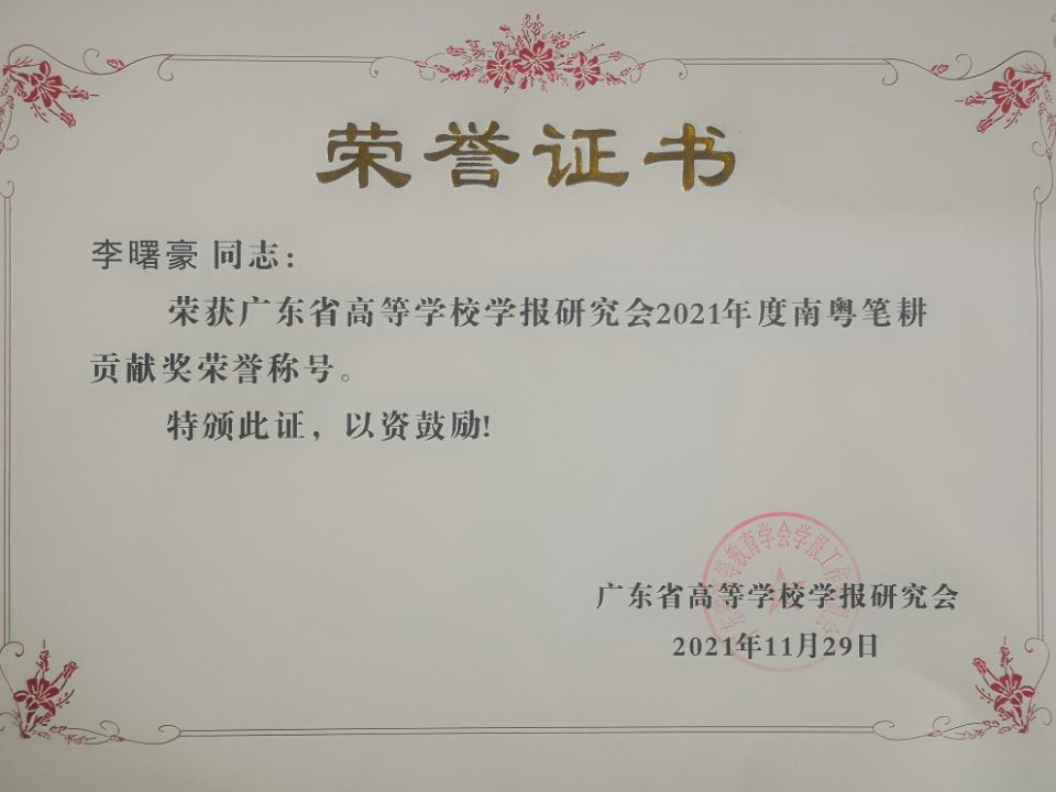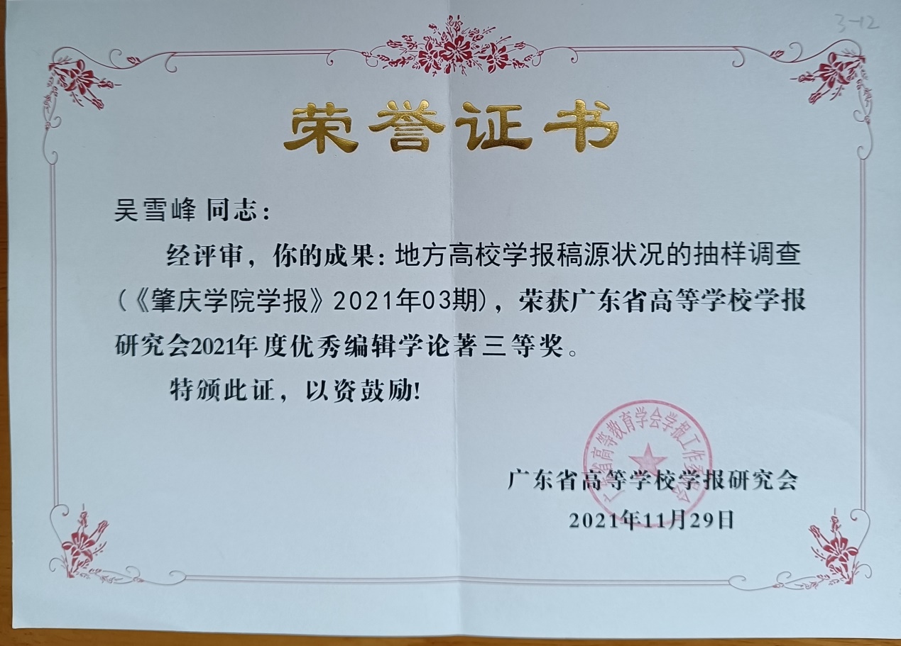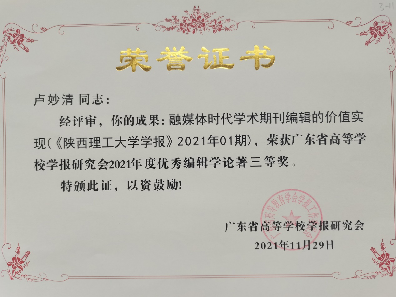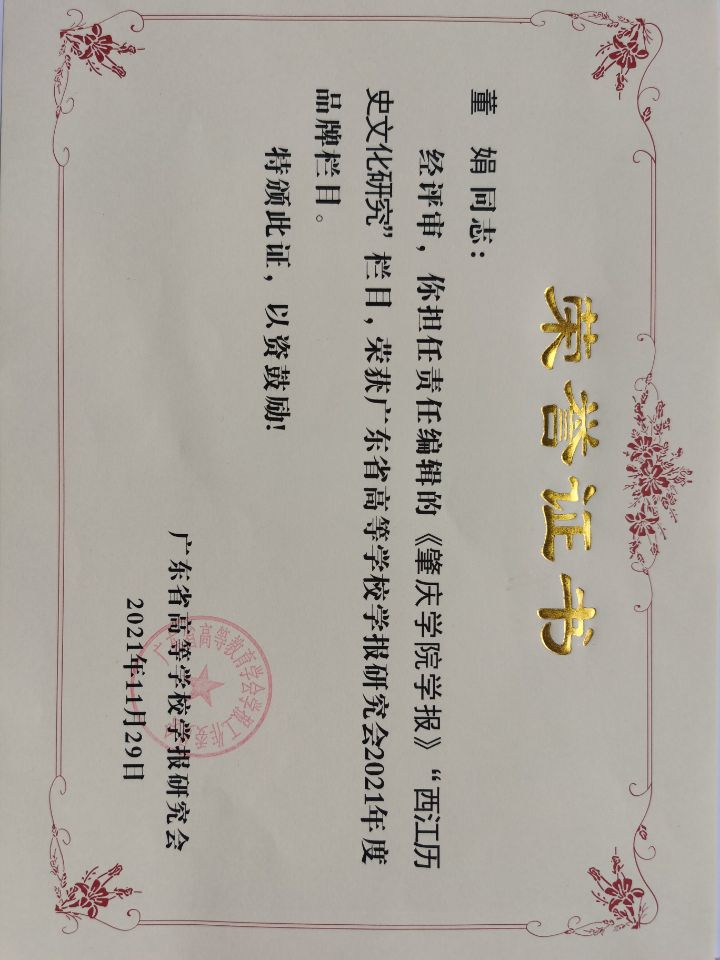 会议评选出南粤优秀笔耕贡献奖、优秀编辑学论著、品牌栏目、优秀青年编辑等奖项,并进行了颁奖。我校在此次评奖中荣获多项奖励,包括李曙豪荣获南粤笔耕贡献奖,董娟老师担任责任编辑的《肇庆学院学报》“西江历史文化研究”栏目获评品牌栏目,卢妙清老师、吴雪峰老师的论文荣获优秀编辑学论著三等奖。