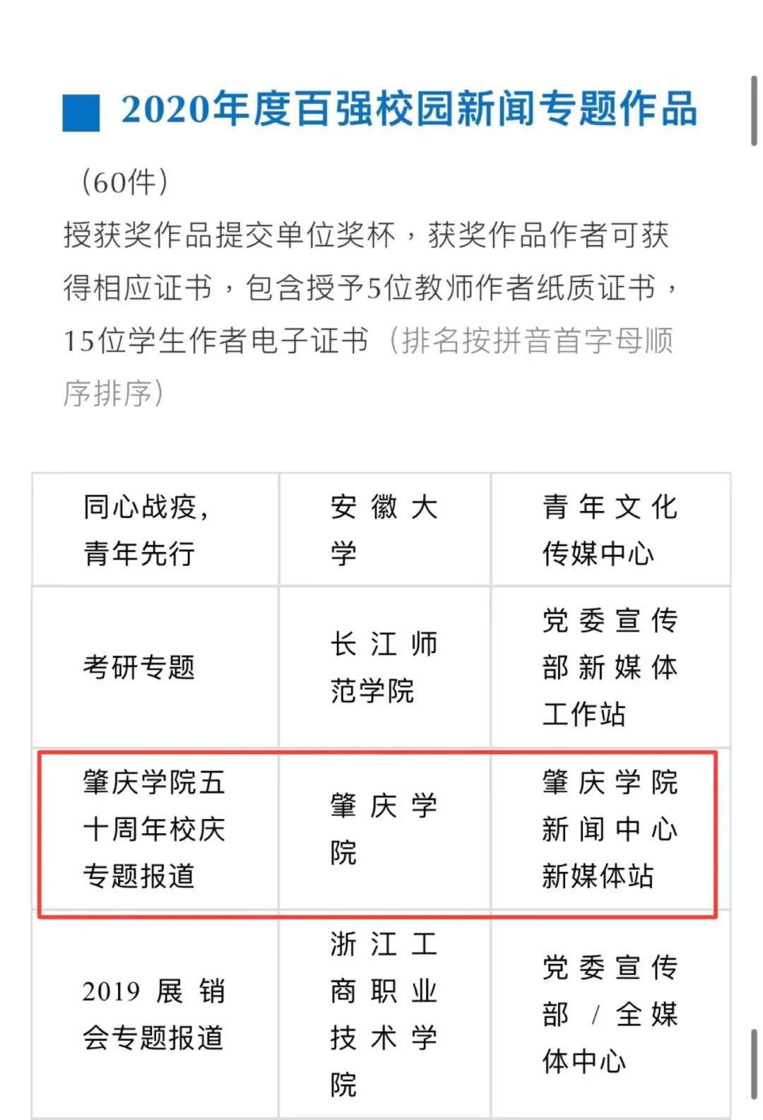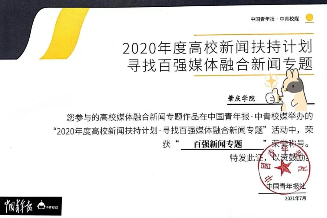 本网讯 近日,由中国青年报社、中国青少年新媒体协会、中青校媒联合主办的2020年度全国百强校媒融合新闻专题评选结果揭晓,由我校党委宣传部教师联合指导、新闻中心新媒体站负责制作的“肇庆学院五十周年校庆专题报道”获“2020年度百强校园新闻专题作品奖”!