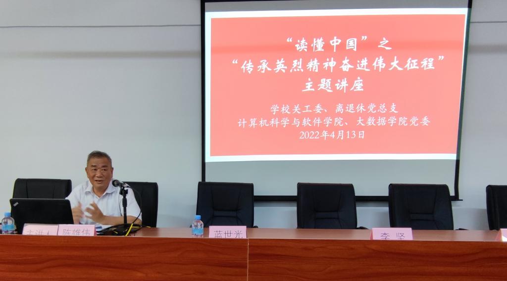 由关工委、离退休党总支和旅游与历史文化学院、计算机科学与软件学院、文学院等三个学院党委联合主办,题为《传承英烈精神 争做新时代的奋斗者》的讲座,依次在上述三个学院展开。