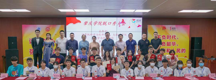 本网讯 6月10日晚,由计算机科学与软件学院/大数据学院、数学与统计学院、音乐学院及文学院四大学院易班学生工作站联合举办的肇庆学院首届脱口秀大会决赛在大学生活动中心二楼青年舞厅举行。党委学生工作部(处)副部(处)长罗永全、思想政治教育科副科长李鑫,计算机学院党委副书记陈彦雄,音乐学院党委副书记陈瑛瑛,数学院党委副书记高洁云以及来自四大学院易班学生工作站的指导老师邹卫、张驰、朱乾峰、杨旭担任决赛评委。