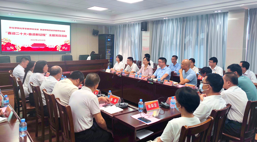 环化学院学院党委书记李湘、副院长吴燕妮、副书记杨原行,旅游学院院长李朝军、党委书记杨雪梅以及教师党员代表参加。