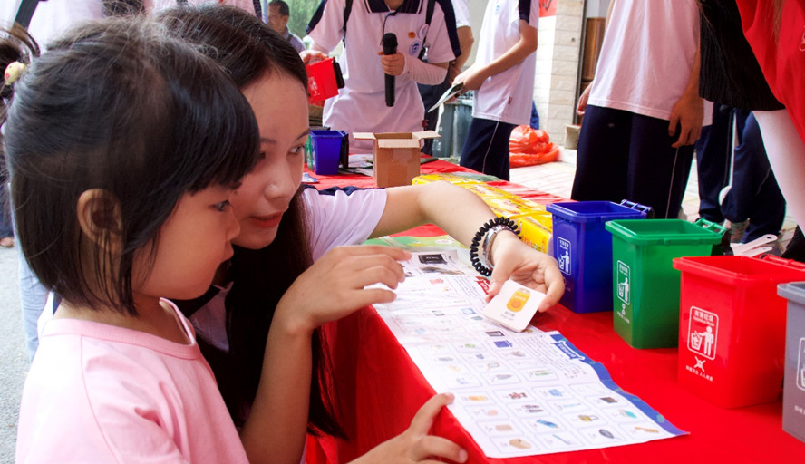 图为实践队员在跟小朋友一起做游戏,并正确引导小朋友进行垃圾投放