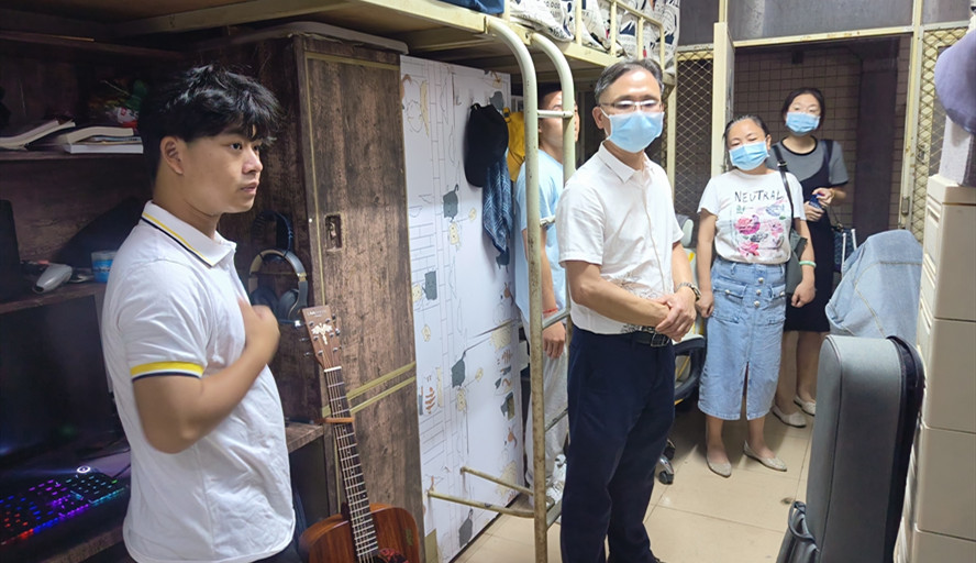 关怀入寝,情暖人心。学院党委书记植可焕紧急召开疫情防控工作部署会,与会人员包括学院领导、教研室主任、全体辅导员、全体班主任。会议传达学习、深入贯彻落实学校疫情防控工作的最新会议精神及文件要求,并启动音乐学院疫情防控应急方案,会后,植可焕带领全体辅导员、班主任下沉到学院学生宿舍,及时了解学生思想、学习、生活动态和需求。