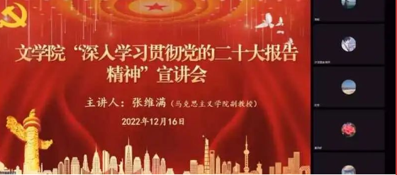张维满表示,党的二十大报告,为新时代新征程党和国家事业发展指明了前进方向,确立了行为指南,是一部党带领全国各族人民全面实现中华民族伟大复兴的政治宣言和行动纲领,希望文学院师生把学习党的二十大精神的成果转化为推动个人和学院各项事业高质量发展的强大动力。