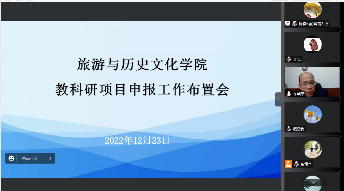 本网讯 为进一步贯彻学校科研工作会议精神,继10月9日召开全院科研工作布置会后,旅游学院于12月23日通过腾讯会议再次召开2023年项目申报工作布置会。李朝军院长主持,党委书记杨雪梅,副院长郭栩东、周军,党委副书记陈军以及系部主任、全体教职工参加会议。