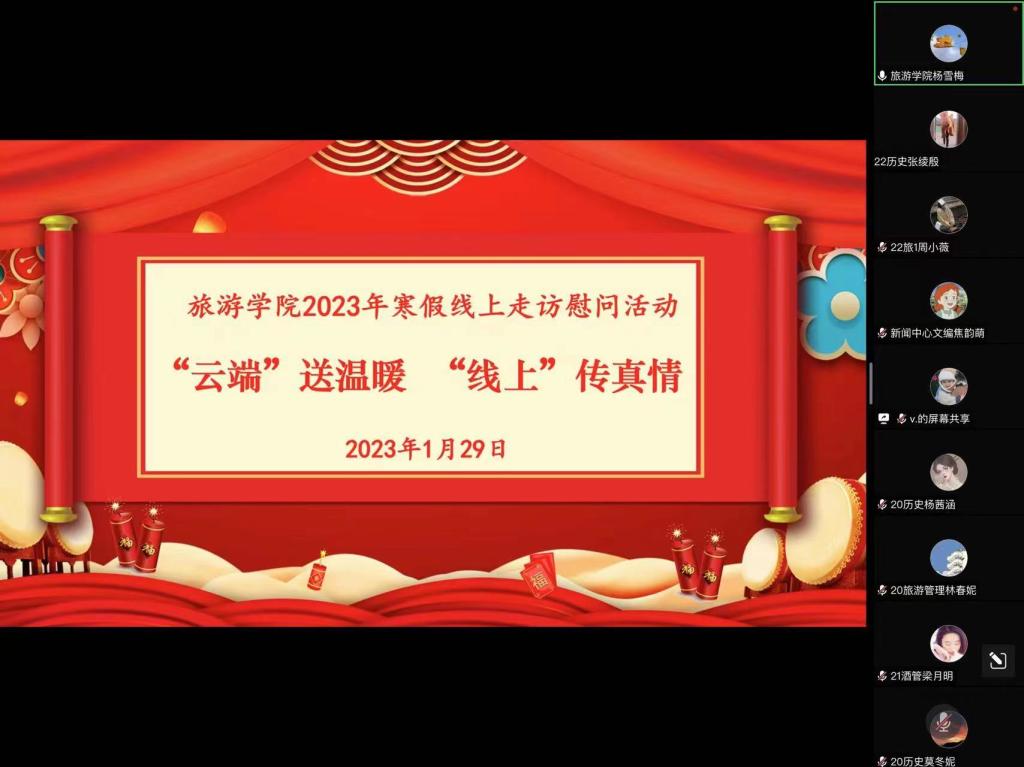 本网讯 1月29日,旅游学院组织开展“云端”送温暖 “线上”传真情2023年寒假线上走访慰问活动,与学生代表、家长代表进行“面对面”的问候和交流,了解学生实际情况,传递学院温暖。学院党委书记杨雪梅参加活动。