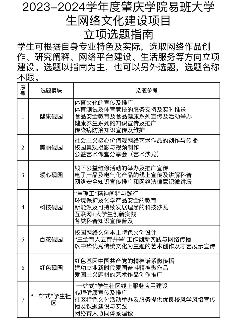 具体选题可参照附件1《2023-2024学年度肇庆学院大学生网络文化立项建设选题指南》,也可立足专业、校园生活实际自拟题目。