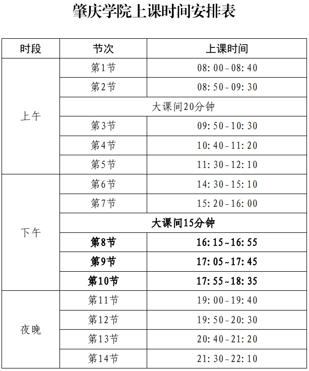 2.下午第8节、第9节和第10节的上课时间分别顺延5分钟,即第8节上课时间为16:15~16:55,第9节上课时间为17:05~17:45,第10节上课时间为17:55~18:35。