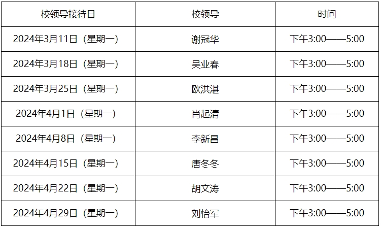 请有意来访的师生员工于校领导接待日的前一周周五下午17:00前填写《肇庆学院校领导接待日预约登记表》并发送至电子邮箱huangzuxin@zqu.edu.cn进行预约,党政办公室协调安排后,将通知预约人具体接待时间。