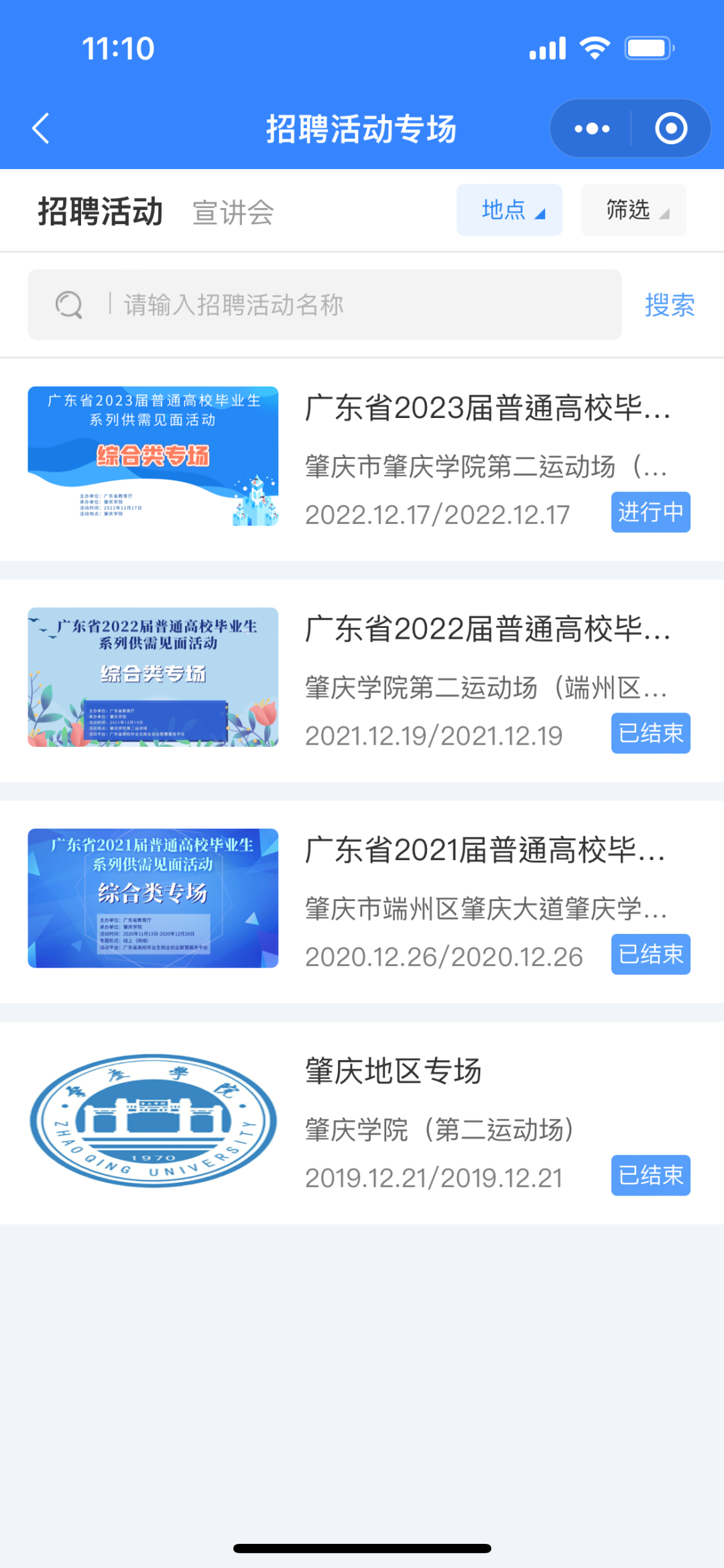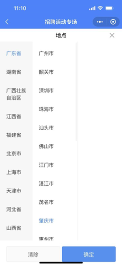 进入招聘活动专场后,点击右上方的地点,选择广东省/肇庆市,进入12月17日“肇庆学院综合类专场”;