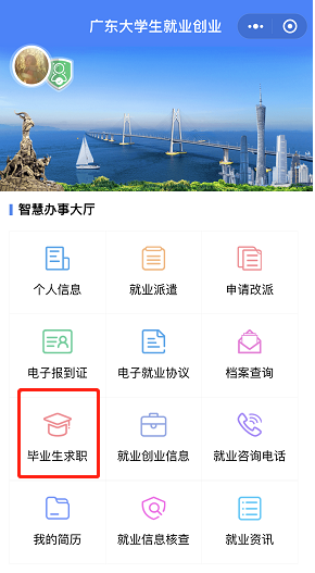 登陆“广东大学生就业创业”微信小程序,选择“毕业生求职”模块;