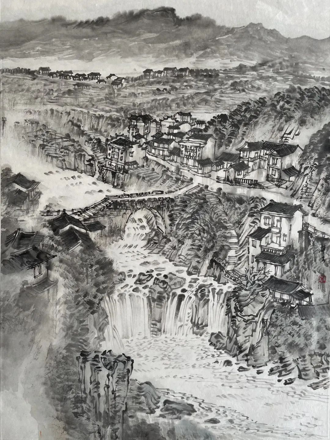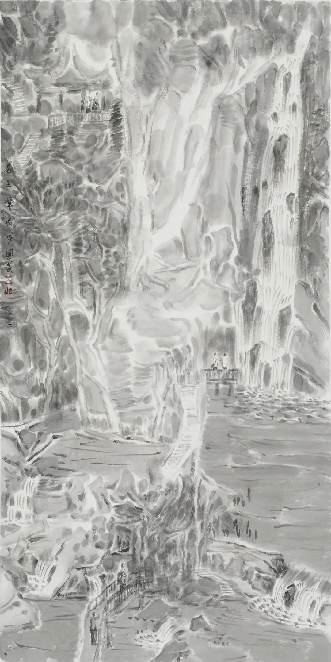 黄国武《井岗龙潭飞女瀑》 纸本墨笔 138×69.5cm 2022年