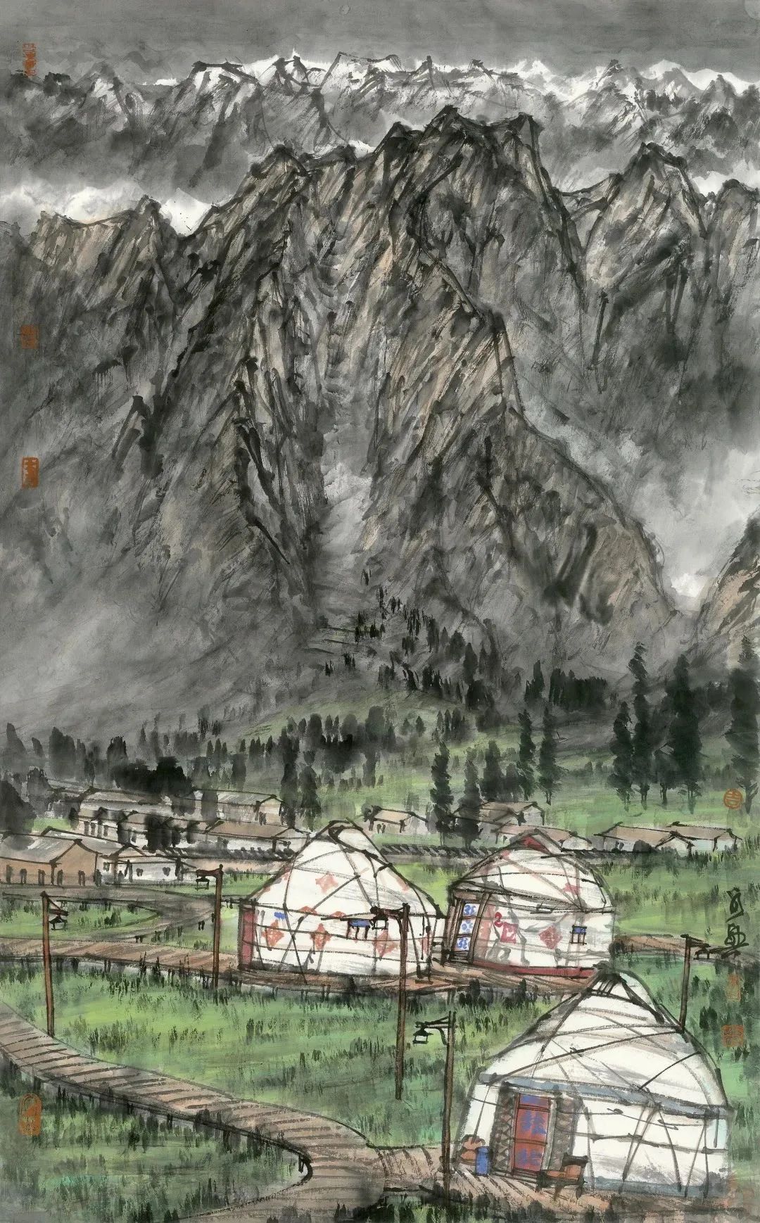 陈水兴《巴里坤湖畔人家》 纸本设色 97x60cm 2022年