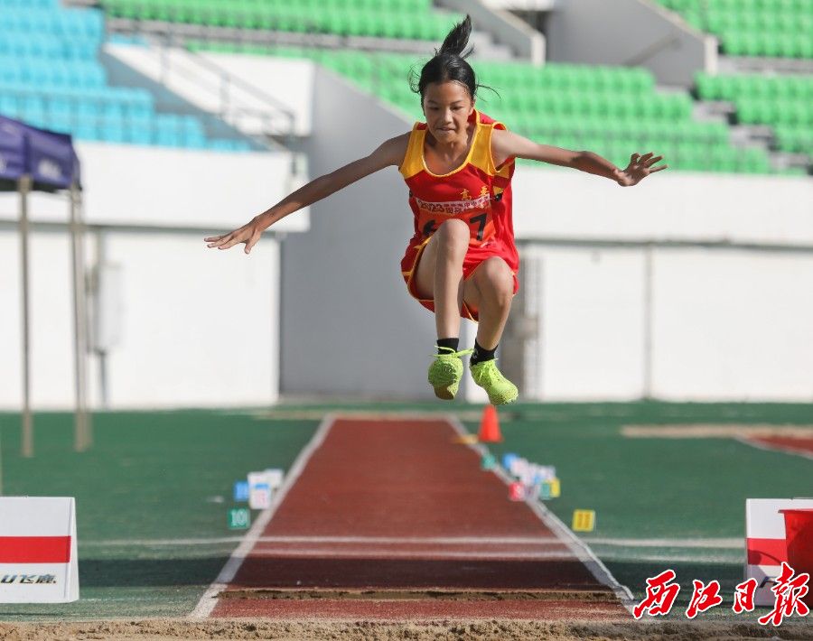 图为运动员在女子小学组跳远决赛中。西江日报记者 梁小明 摄