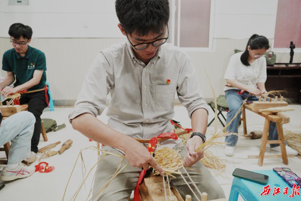 肇庆学院的全国青少年井冈山革命传统教育实践团奔赴井冈山, 编草鞋重温革命先辈精神。肇庆学院供图