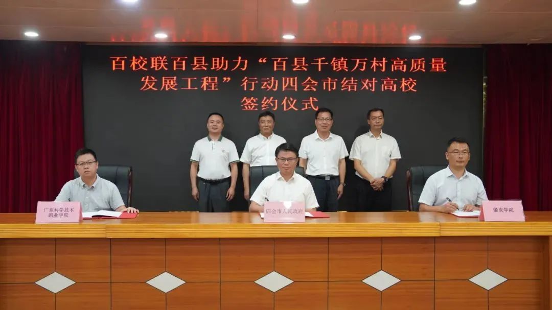 8月9日,肇庆学院、广东科学技术职业学院与肇庆四会市举行“双百行动”结对签约仪式。接下来,三方将携手合作共建,把县域所需和高校所能相结合,推动实现县域高质量发展与高校高质量发展的互利双赢。